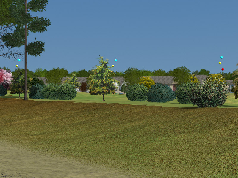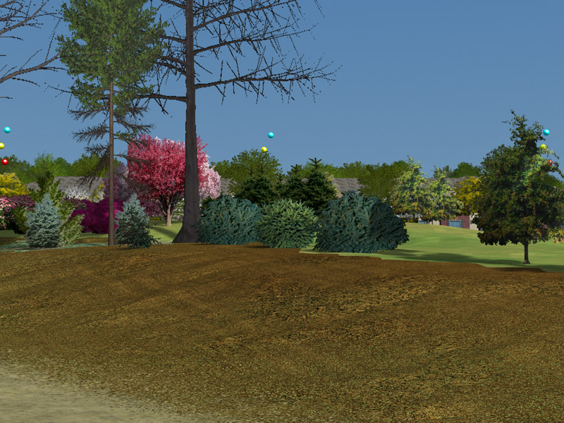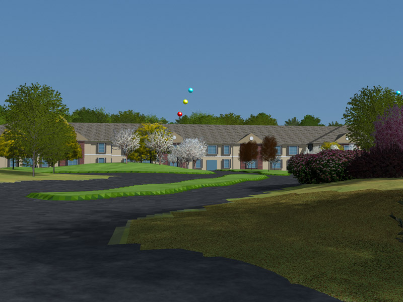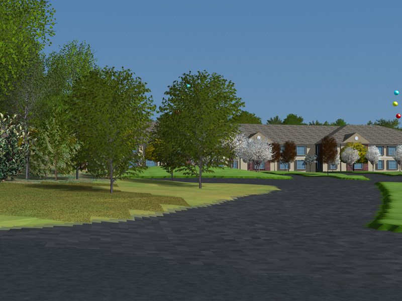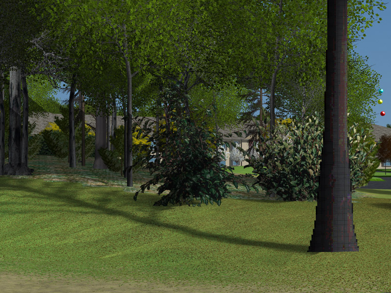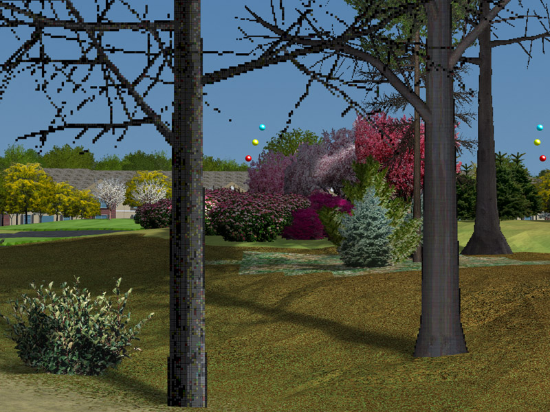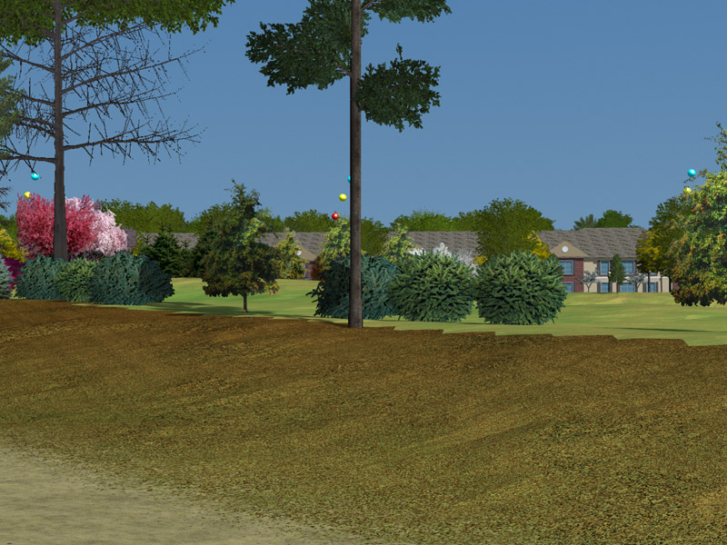 A complete model of the site and its environs was created using CAD drawings, existing GIS information, and sophisticated visualization software (Visual Nature Studio). In addition to the actual building, landscaping features such as clearings, lawns, and ornamental trees and shrubs were added to the model. Hardscaping such as entrance roads, sidewalks and parking lots were also included in the model. Surrounding trees were generated based on the species mix in the area, tree density, and typical tree heights. The figure below shows a simulated view from a given height above the model.